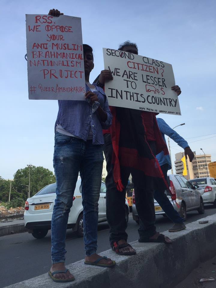 Greeshma Aruna Rai, an Ambedkarite, carried a placard that read “RSS! We oppose your anti-Muslim, brahminical nationalism project” signed with #QUEERAMBEDKARITES. This was one of the placards that made some gay men call Chennai Rainbow Pride to be a shameful event and divisive. While she is optimistic about the politics that is spoken in the Pride parade, she is strong in her criticism on how the intersectional politics is spoken only during the Pride parade and in the press release. She wants the alliance to be an ongoing effort with the Dalit movement and other marginalised communities.