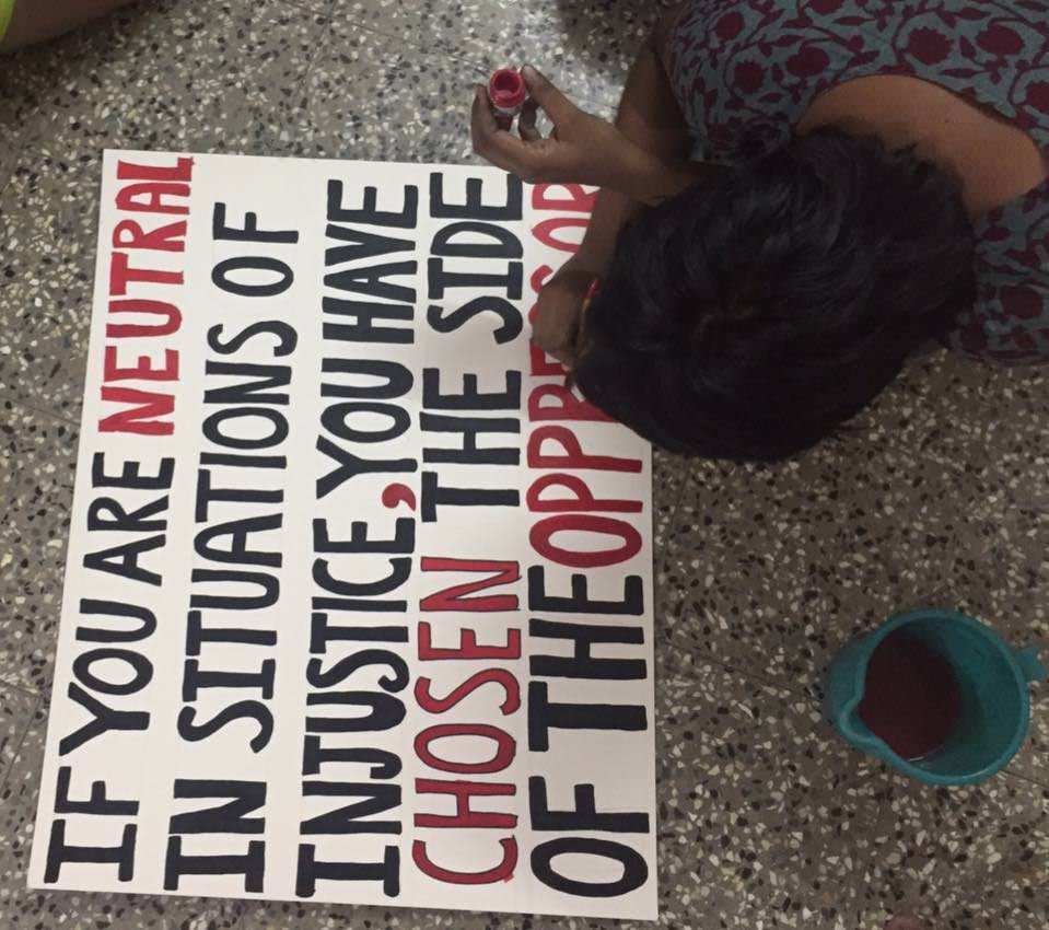 As expected, this did not sit well with some in Chennai and there was a visible backlash from other cities criticising Chennai queer politics for diluting the LGBTQIA+ ‘cause’. Gireesh, a Chennai based artist and poet who was involved in organising Chennai Rainbow Pride in the initial years carried a placard that read, “If you are Neutral in situations of injustice, you have Chosen the side of the Oppressor,” a historical quote by South African social rights activist Desmond Tutu. Gireesh said that the message was for both the Queer community and the larger society. He points out the exclusionary politics within the Queer community that keeps critical voices at bay. But his criticism is at individuals – mostly his friends – who turn a blind eye towards such instances.