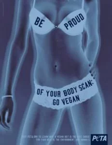 PETA protects animals and animal rights. The advertisement on the left that we see here though, seems to be asking us to go vegan, because it helps you remain thin, not because you would be preventing animal cruelty if you do.