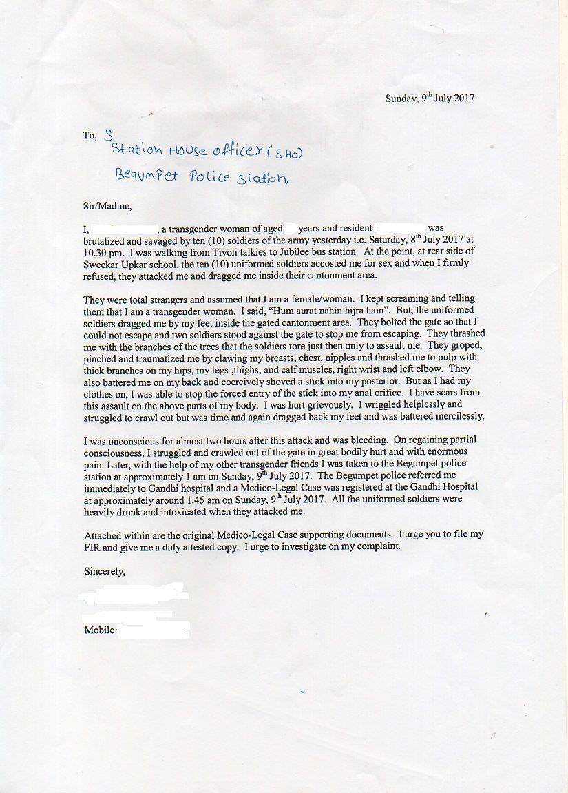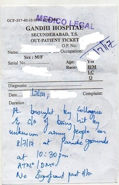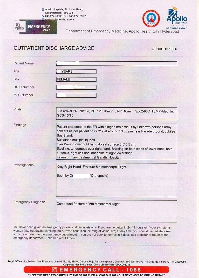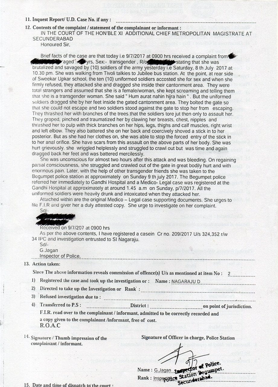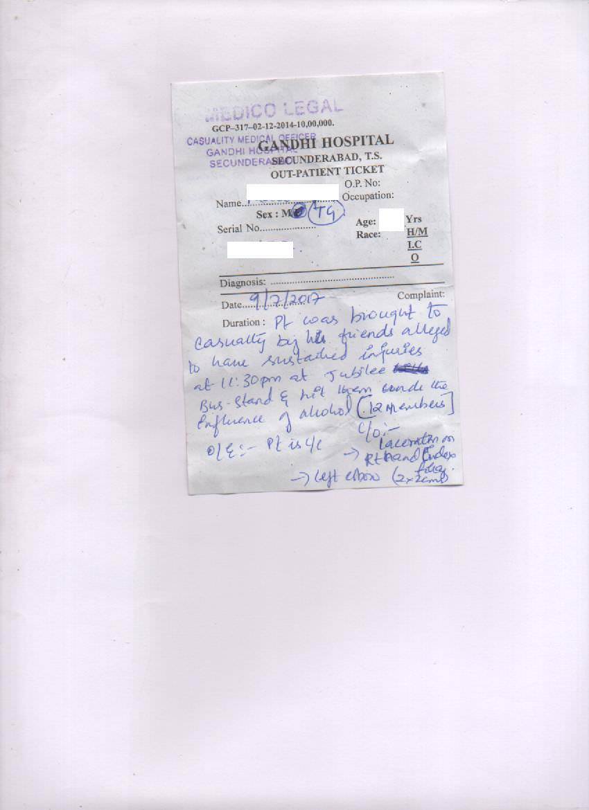 This brutal attack, coupled with bleeding, left the survivor unconscious for almost two hours and it was only after regaining partial consciousness, she struggled and crawled out of the gate with enormous pain. Later, with the help of a few other transgender women, friends she was taken to the Begumpet police station at approximately 1 AM on 9th July. The Begumpet police referred her immediately to the Govt. Gandhi Hospital and a Medico-Legal Case was registered at the Gandhi Hospital around 1.45 am on 9th July.