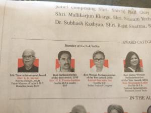 A classic case of the manel if ever there was one. The front page of yesterday’s Hindustan Times carried a full page advert of an awards event for parliamentarians, with the headline ‘honouring the leaders amongst leaders’. The event was sponsored by Lokmat – a newspaper popular in Maharashtra and Goa. Eight award categories and their winners were listed, four for each house of Parliament: lifetime achievement award, best parliamentarian of the year award, best woman parliamentarian of the year award, and best debut woman parliamentarian of the year award.