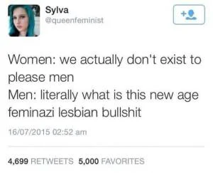 “A feminazi is not a feminist. Feminists believe in equal rights for us, feminazis just make us look stupid. Feminazis believe that all men are idiots, wearing a bra is a symbol of oppression (personally I find bras comfortable), shaving our legs is apparently showing that we GIVE INTO MALE PRESSURE TO BE ATTRACTIVE HOLY SHIT, snowmen must be called “snowpeople”, and that any song that mentions a girl is supporting rape or whatever.”