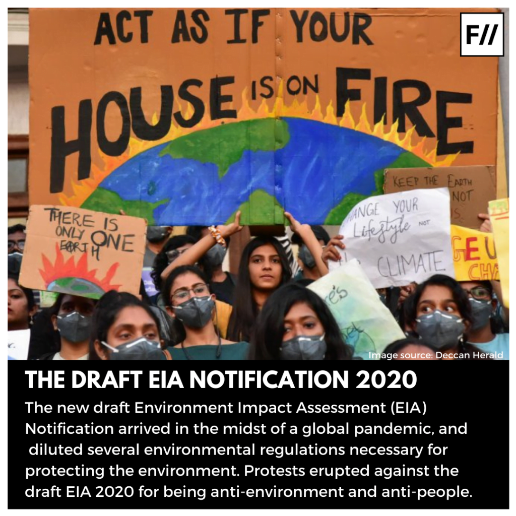 6. The Draft EIA Notification 2020: The new draft Environment Impact Assessment (EIA) Notification arrived in the midst of a global pandemic, and diluted several environmental regulations necessary for protecting the environment. Protests erupted against the draft EIA 2020 for being anti-environment and anti-people.