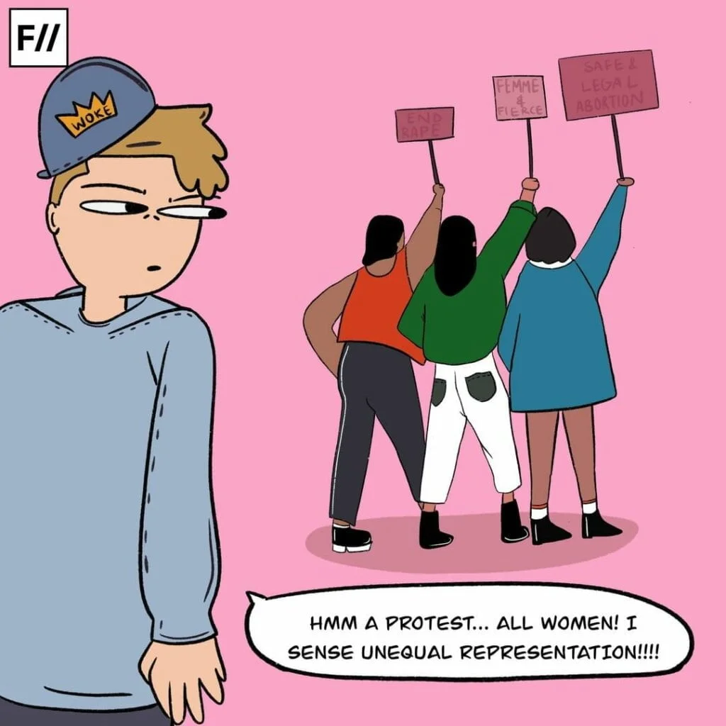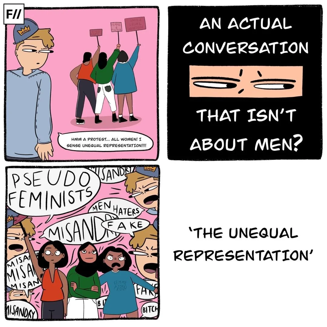 Yes, cis-het men have their own set of struggles. But does that undo the fact that the patriarchy disproportionately impacts other gender identities? Must you only talk about your issues when you see us making space for our conversations? If you only think, “men have problems too” as a counter-response to us talking about gender inequality, you do not care about men’s issues. You care about invalidating the experiences of others.