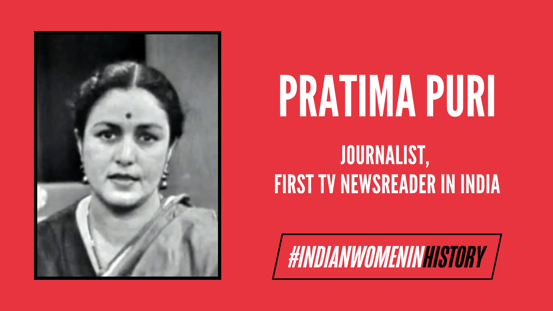 Pratima Puri was the first television newsreader of India. She made her debut in a five minutes news bulletin broadcasted in the first experimental telecast of Doordarshan, the state-owned channel of India. The episode aired on 15 September, 1959 through a small transmitter, during the time when despite many developments in India, women were still bound by stereotypical and patriarchal restrictions. In such a scenario, Pratima Puri was the first female to occupy an influential space in the Indian newsroom.