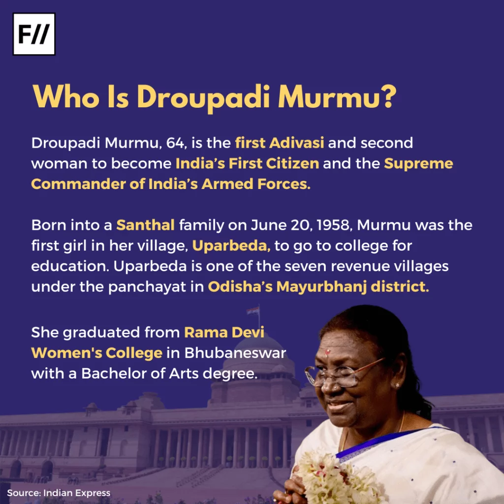 Droupadi Murmu, 64, is the first Adivasi and second woman to become India’s First Citizen and the Supreme Commander of India’s Armed Forces.