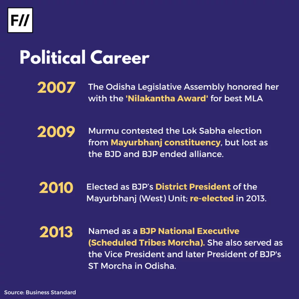 Murmu served two terms in the Odisha Legislative Assembly between 2000 and 2009, in CM Naveen Patnaik’s BJD (Biju Janata Dal) and BJP (Bhartiya Janta Party) coalition government.