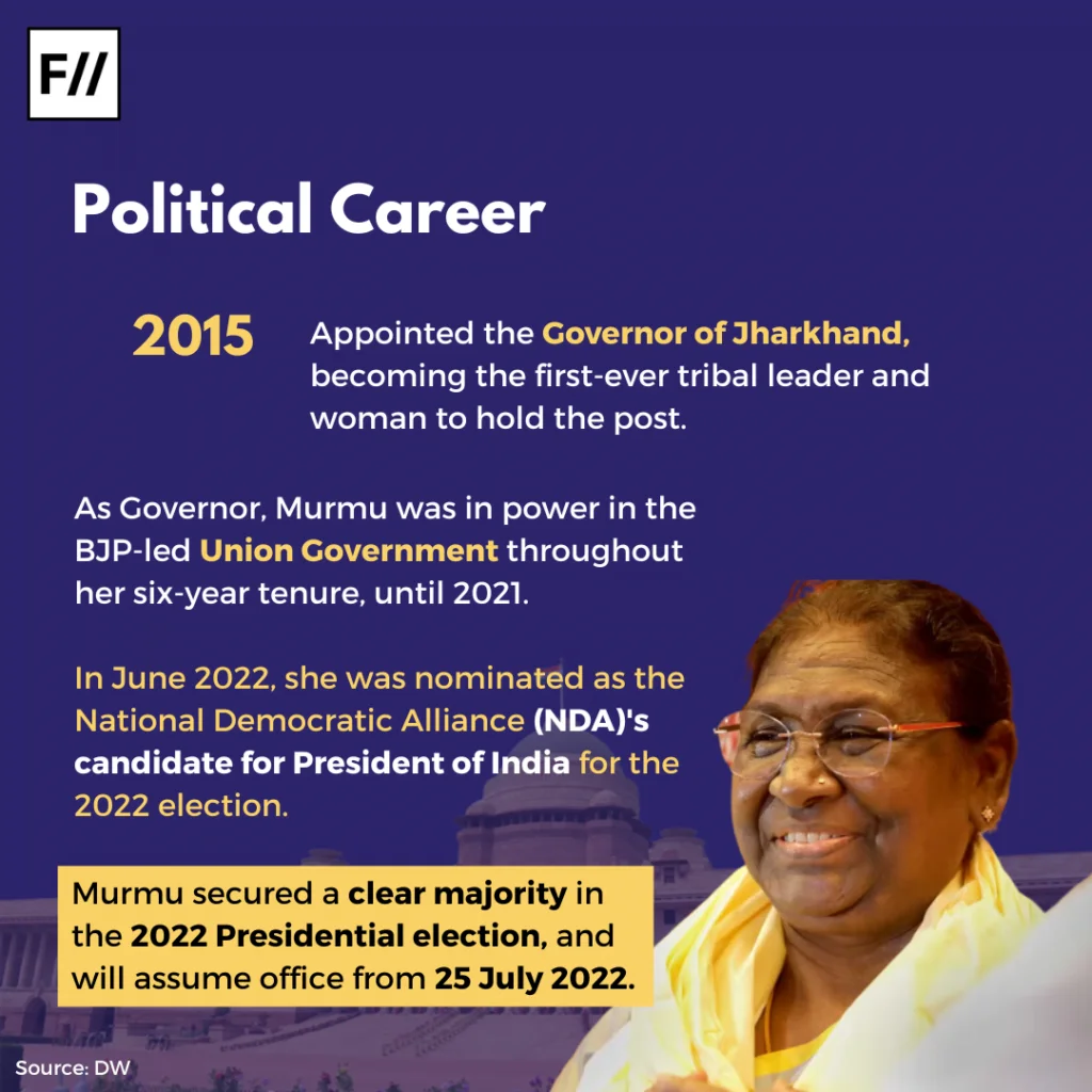 In June 2022, she was nominated as the National Democratic Alliance (NDA)’s candidate for President of India for the 2022 election.
