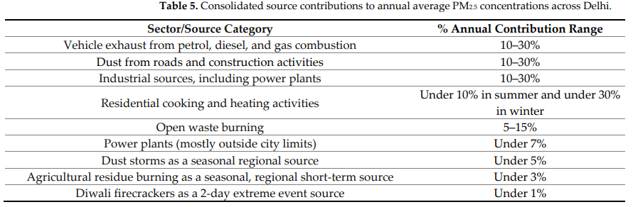 According to a 2023 research by the Centre for Policy Research, a Delhi based think tank, air pollution is not solely attributed to a single cause but rather arises from a multitude of sources. An amalgamated overview of findings from various source apportionment studies is compiled in the table below. The report emphasised, the key sources that require immediate attention are vehicle exhaust, road dust, construction dust, cooking and heating, open waste burning, and industries.