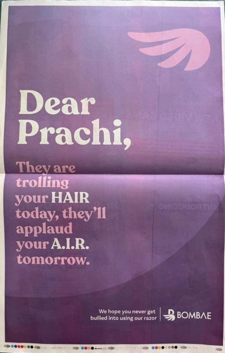 Such was the online virality that The Bombay Shaving Company used Prachi’s case as a testament to optimise their sales and extend a hand to curb cyber-bullying. Such tactics received backlash from a more conscious audience that realised that nonconsensual commercialisation and use of Prachi’s ordeal is one of the most detrimental ways of trying to uplift her spirit. The bottom line of the ad also read, ‘We hope you never get bullied into using our razor.’ This only makes one question the real intention behind this corporate solidarity.