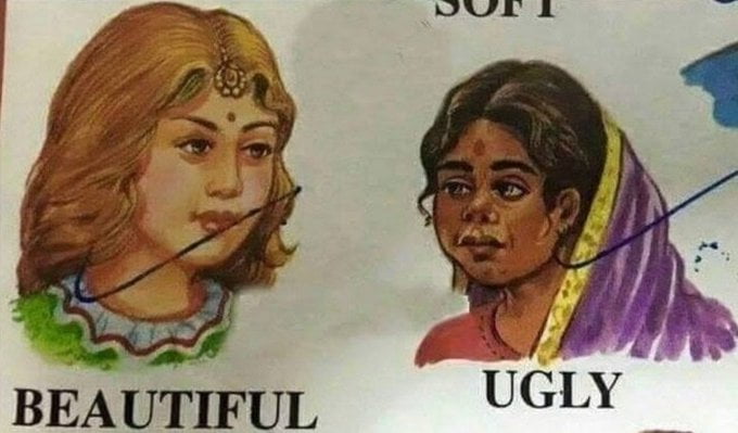 The idea of what is deemed beautiful or ugly is introduced to us from early childhood. Encyclopaedias and school textbooks always displayed images of a fair person with almost-perfect features as “beautiful” and a dark person who wore clothes and accessories conventionally associated with a rural background as “ugly”. The below figure from one of the textbooks proves how the idea of beauty has been ingrained since childhood and is a vital factor in directing the conscious and unconscious minds of individuals and communities.