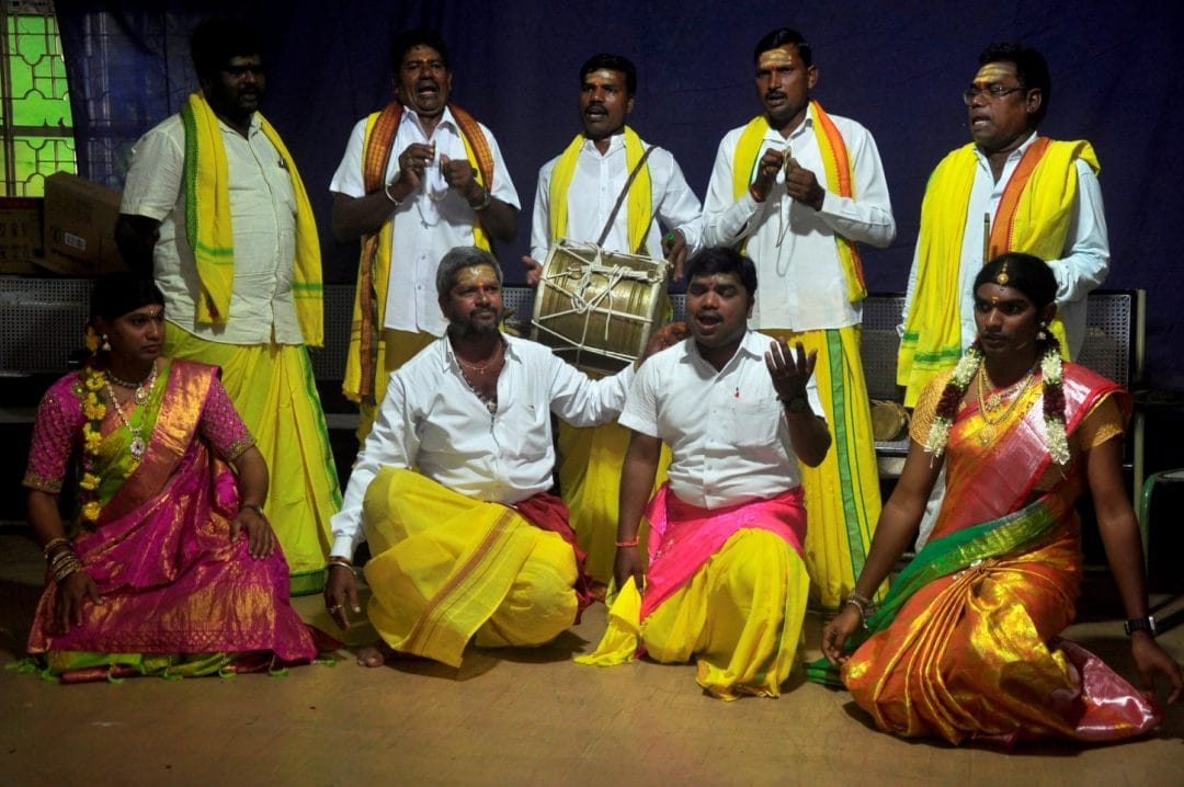 For years, Oggu Katha performances have been dominated by male artists. Although the female character is integral to the narrative, men traditionally dress as women and perform the role. It has been associated with male actors for generations because of the art’s extensive nature of travelling and performing at night.