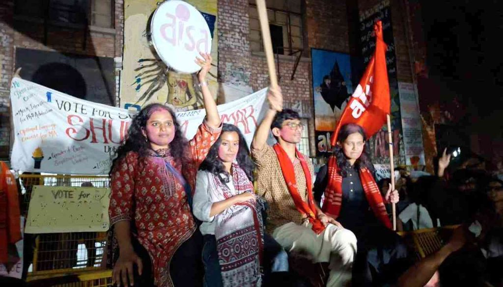 In this year’s election, the Left Unity Alliance secured a sweeping victory over ABVP once again, the coalition of constituted of the All India Students’ Association (AISA), Students’ Federation of India (SFI), and Democratic Students’ Front (DSF). The victory materialised with a 67% voter turnout, with Aditi Mishra of AISA being elected president, the first woman president in six years, being a testimony of a majority of students supporting platforms centred on welfare, inclusion and resistance to centralising pressures.