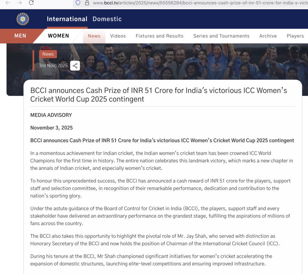 While no player is mentioned by name in this announcement, current or former, the BCCI spends around five short paragraphs praising the contribution of Mr. Jay Shah and writes, “The transformation of women’s cricket in India, from modest beginnings to world-stage triumph owes much to his steadfast vision, his commitment to professionalising the women’s game and ensuring India built a pipeline of talent capable of achieving global success.”