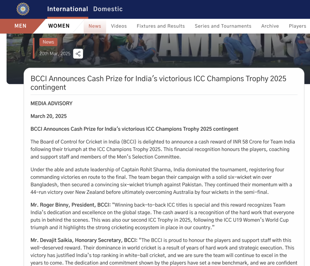 Let us not forget that the men’s team received Rs. 125 crores after their T20 World Cup victory in 2024. More recently, in 2025, the BCCI announced a cash award of Rs. 58 crores after the men’s team won the ICC Champions Trophy. Here, they did not forget to mention the captain’s contribution. The BCCI wrote, “Under the able and astute leadership of Captain Rohit Sharma, India dominated the tournament, registering four commanding victories en route to the final.”